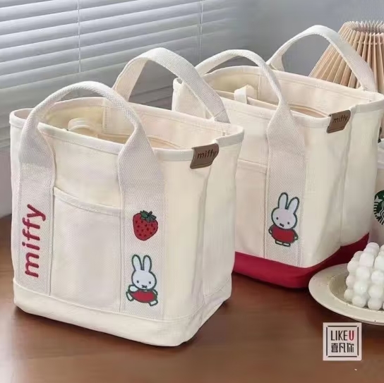 初构想兔子刺绣日系可爱帆布包女宝妈外出手拎包便当上班族手提包女SN22 白红双拼草莓