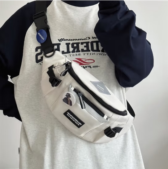 酷咖斜挎包男休闲胸包女韩版背包潮流大容量运动手机包 白色(熊猫挂件+徽章)