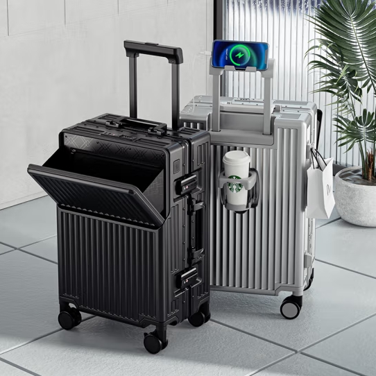 珉璐保罗前开盖行李箱男商务笔记本拉杆箱万向轮登机箱水杯架旅行皮箱子女 枪色 前开盖+刹车+杯架+充电 20英寸 【可登机】